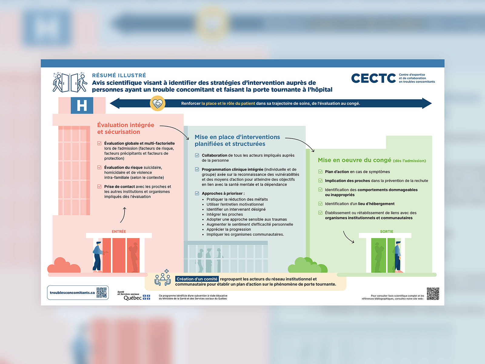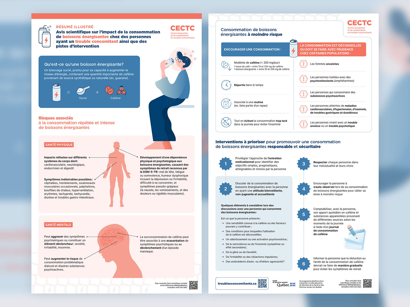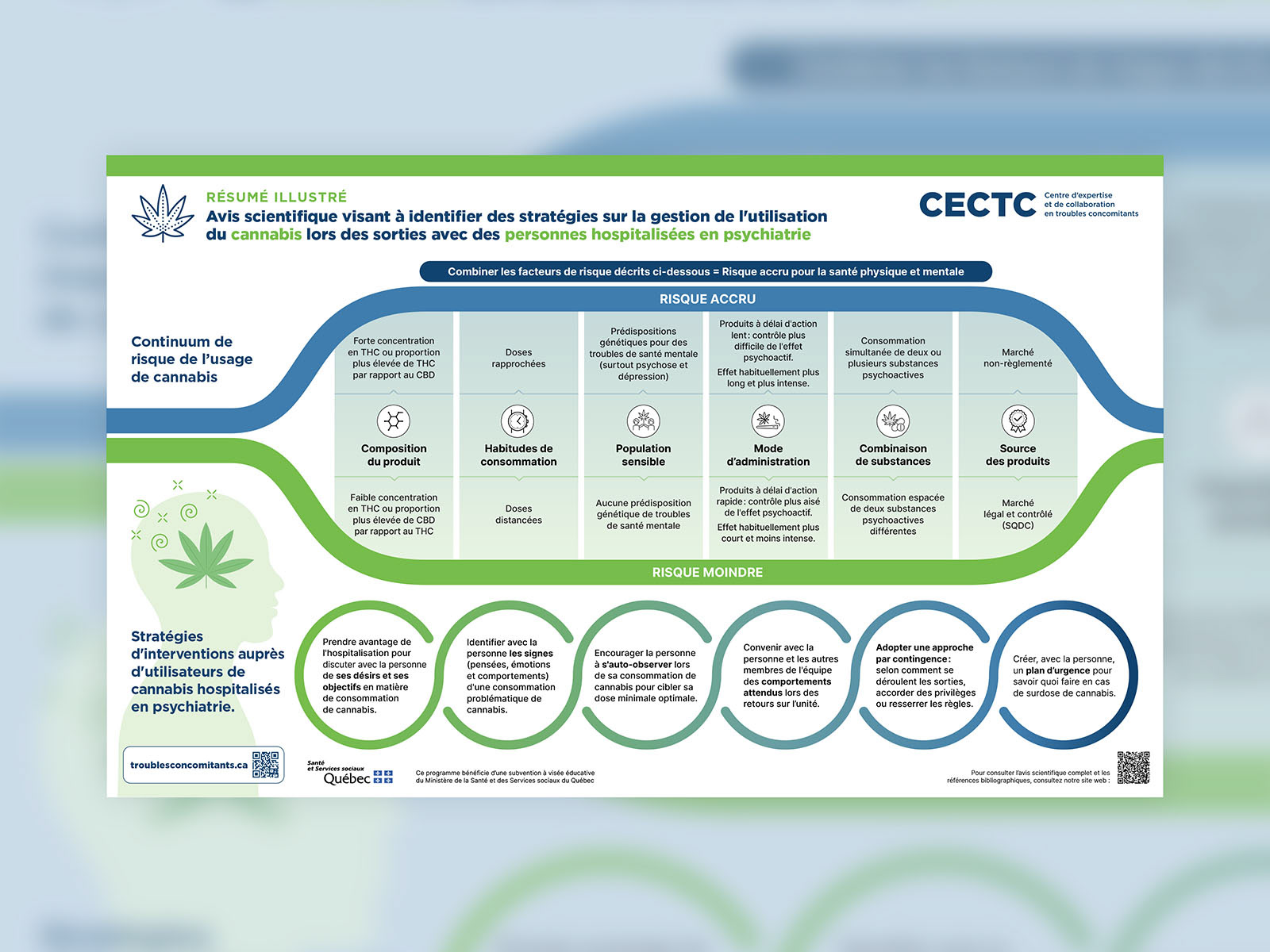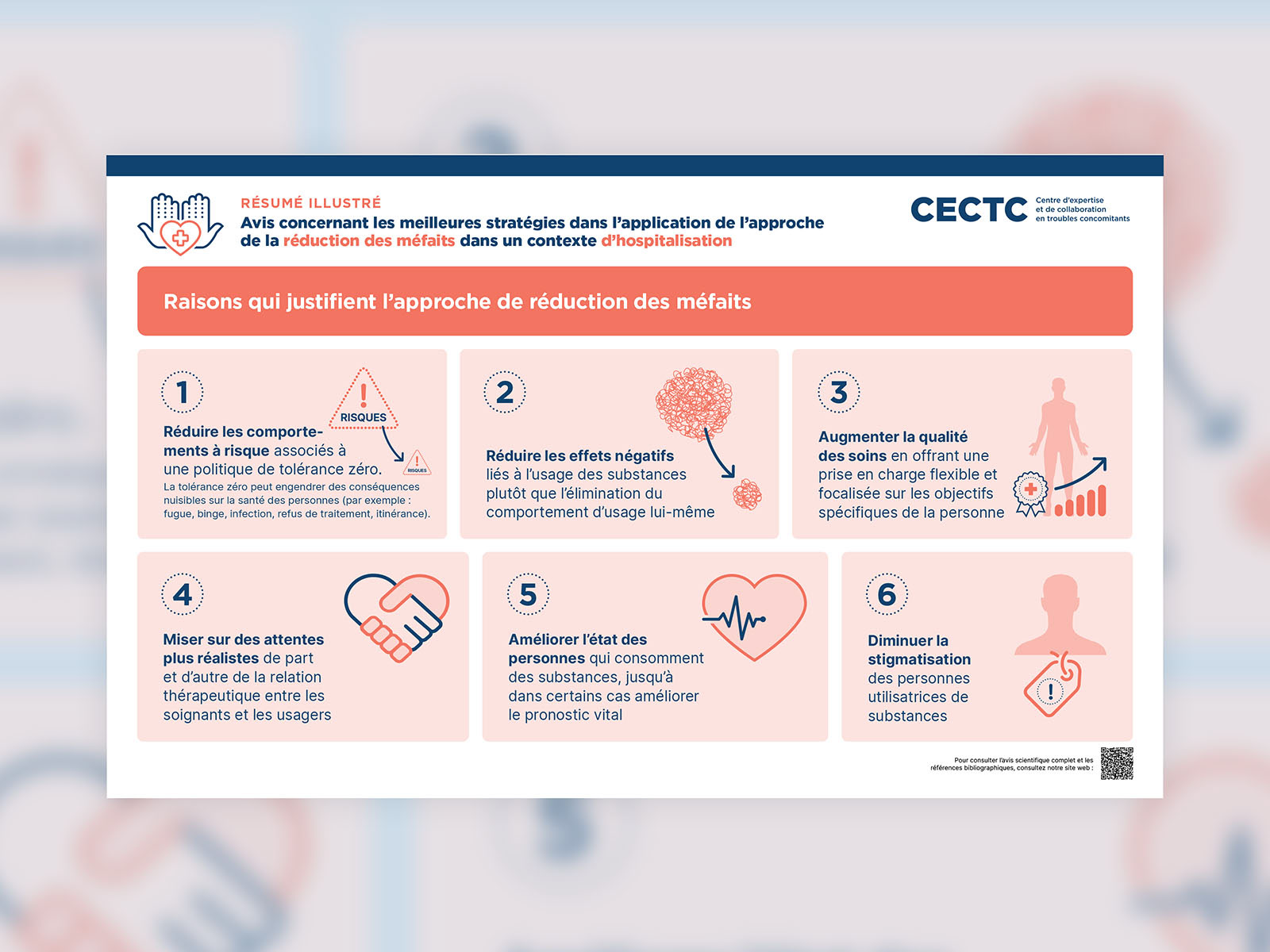 Le Centre d’expertise et de collaboration en troubles concomitants du CR CHUM rédige des avis scientifiques portant sur l’organisation des services ainsi que sur les aspects biologiques, pharmacologiques et psychosociaux liés aux troubles concomitants. Ces avis s’appuient sur des données probantes. Le CECTC nous a mandaté de traduire visuellement les conclusions de ses différents avis afin de rendre accessibles et compréhensibles des concepts parfois abstraits ou émergents.